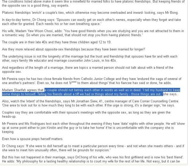 I felt that I could relate to it. Not that we are meeting friends of the opposite sex, but how some points brought up differentiates a marriage from a relationship. Some people just do not understand, so they think that I'm a problem to the marriage.